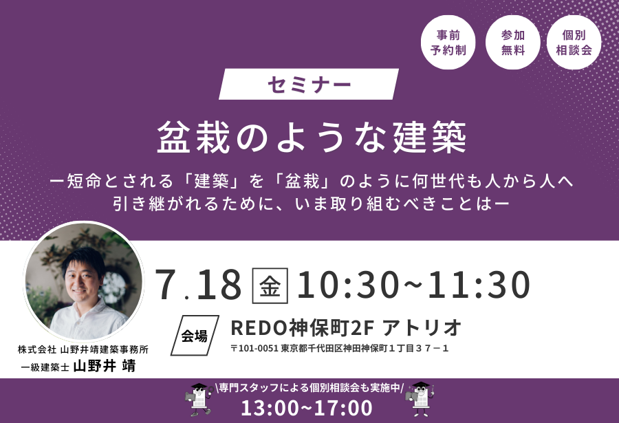 【セミナー】盆栽のような建築~短命とされる「建築」を「盆栽」のように何世代も人から人へ引き継がれるために、いま取り組むべきことは~