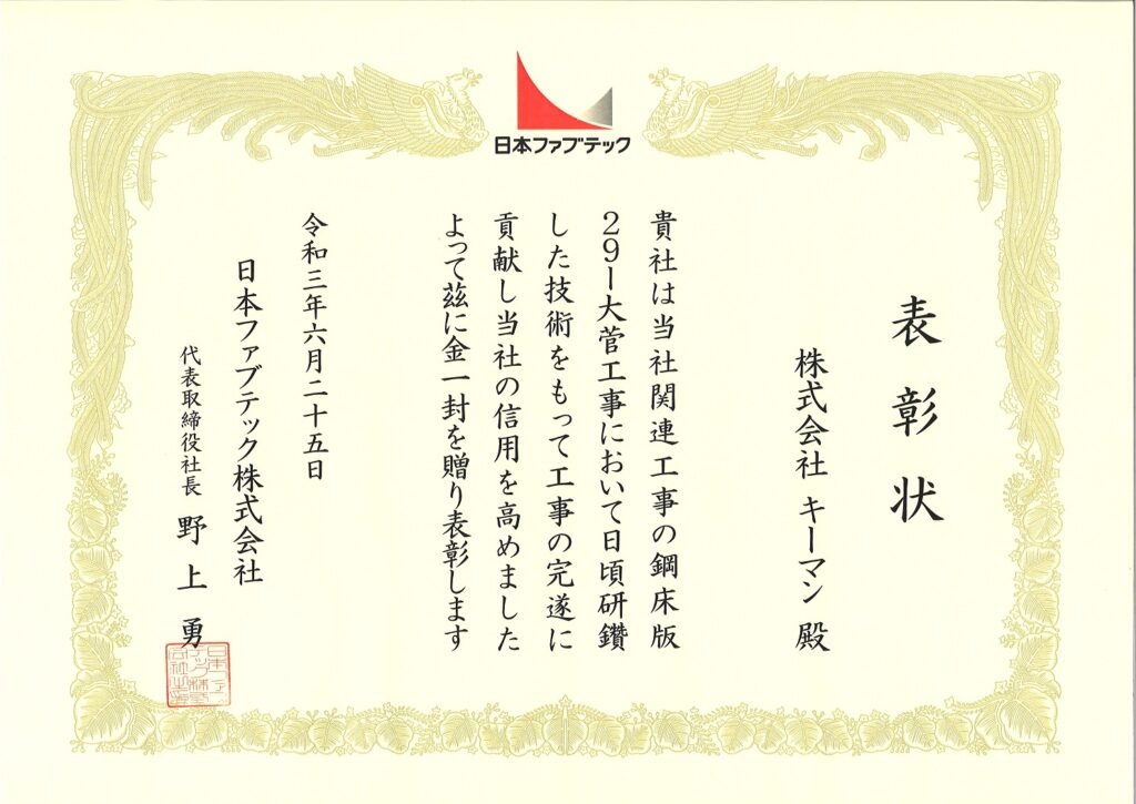 鋼床版29-大管工事の施工において、弊社の技術が評価され、日本ファブテック株式会社様より表彰状を授与いたしました。