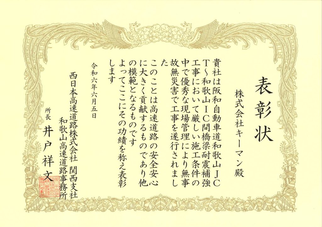 阪和自動車道 和歌山JCT~和歌山IC間 橋梁耐震補強工事の施工において、安全管理・災害防止の努力が評価され、西日本高速道路株式会社(NEXCO西日本)様より表彰状をいただきました。