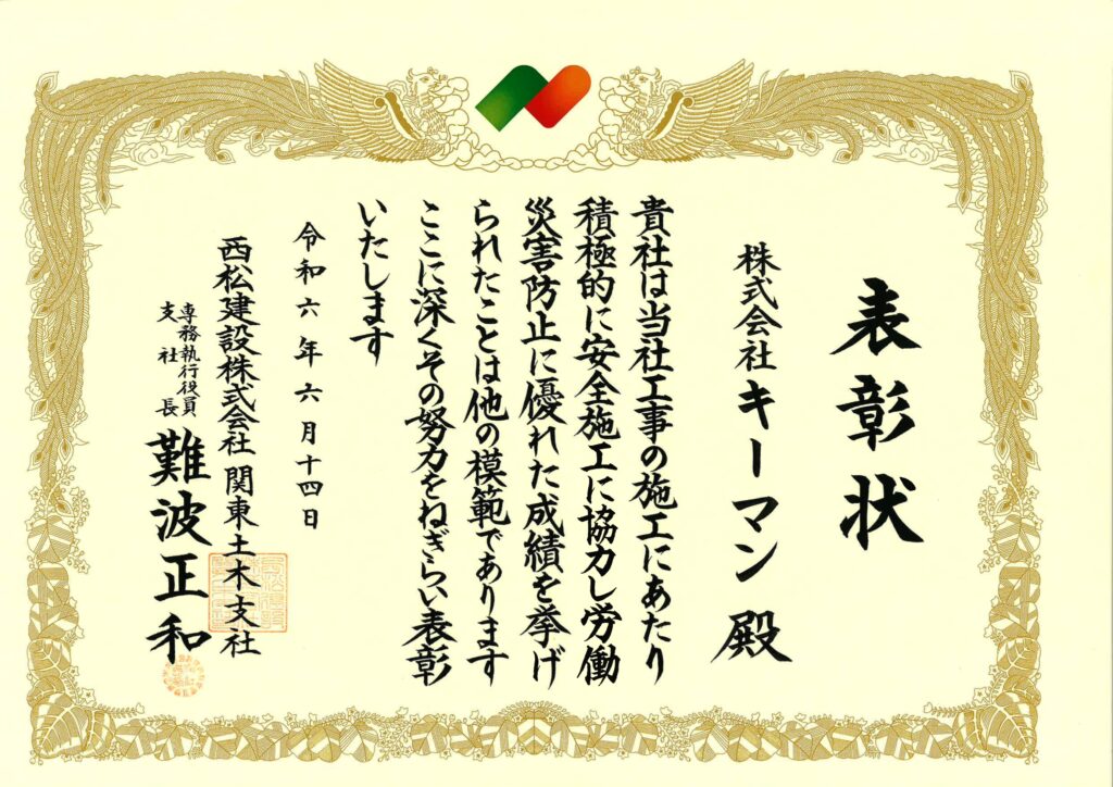 西松建設関東土木支社より企業表彰として「安全衛生委員長賞(支社長賞)」を受賞いたしました。
