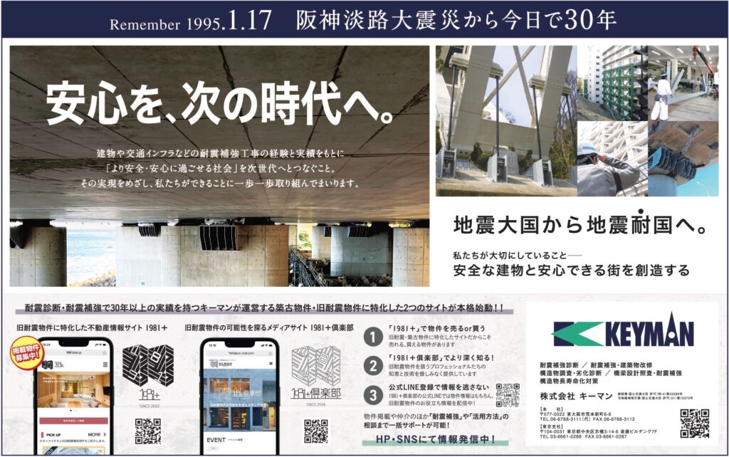 産経新聞 大阪市内版 新聞広告 掲載 令和7年1月17日発行 産経新聞 大阪市内版に広告掲載いたしました。 阪神淡路大震災から今日で30年。 耐震補強を行う企業としてこの日を忘れず、街の安心・安全にこれからも貢献してまいります。 FacebookXBlueskyHatenaCopy