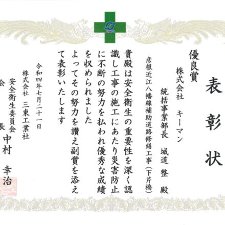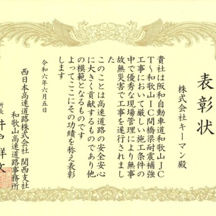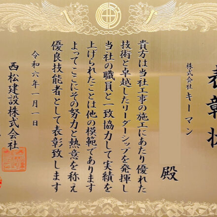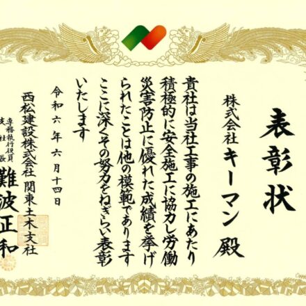 西松建設株式会社 関東土木支社様より表彰状受賞