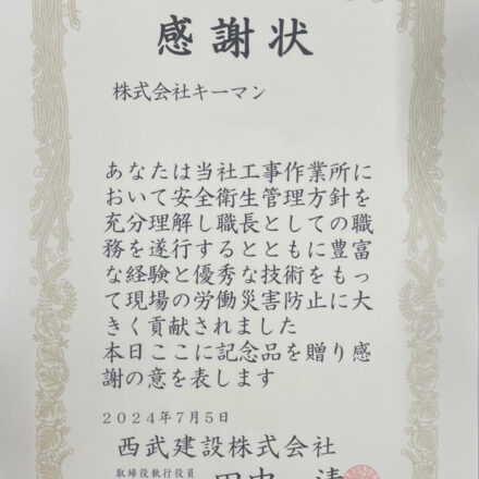 西武建設株式会社 2024年度 安全衛生表彰式にて「感謝状」受賞