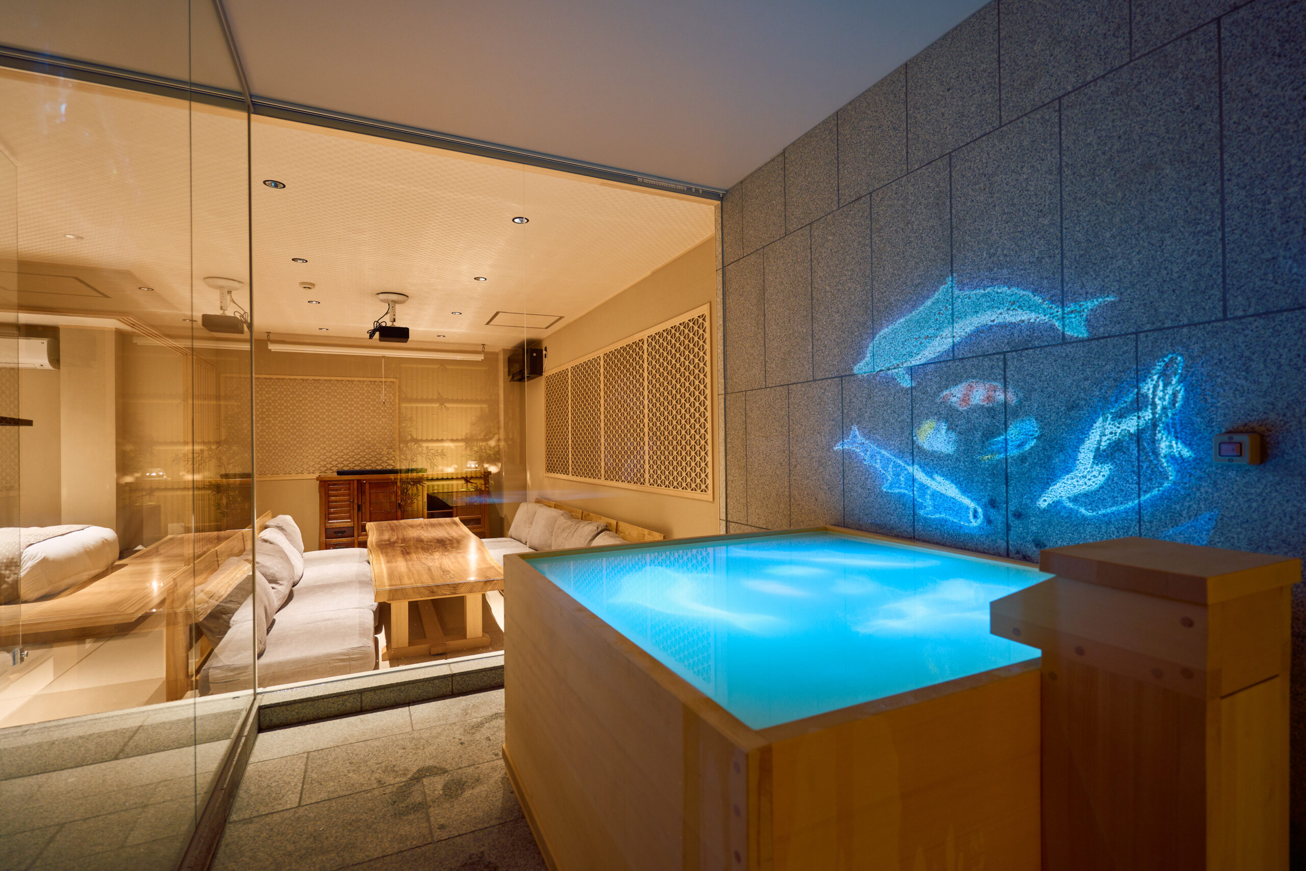 天保山といえば世界最大級とされる『海遊館』が人気スポットということで、『生洲』は水族館の歴史を遡ることから始めました。すると、今の時代でいう水族館は、生洲にルーツがあることがわかったんです。昔は生洲に泳がせる魚を…それこそ池の鯉のように、上から見て背中の模様を楽しんでいたとも聞きました。その話をヒントに今と昔の水族館体験をコンセプトにしようということになり、プロジェクションマッピングを用いた演出を考えました。入浴剤で白濁させたお湯の表面にプロジェクターで照射すれば、魚が泳いでいる雰囲気を楽しんでいただけます。