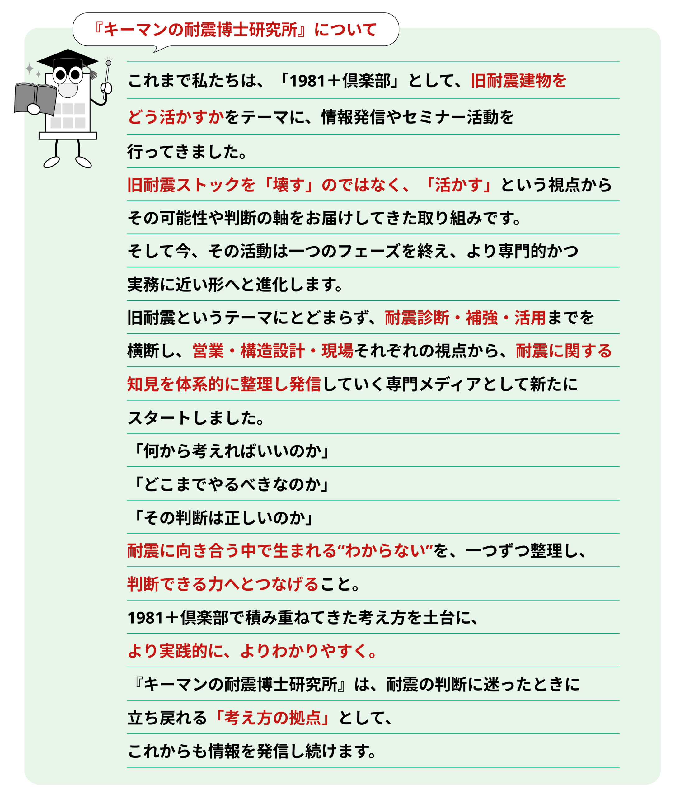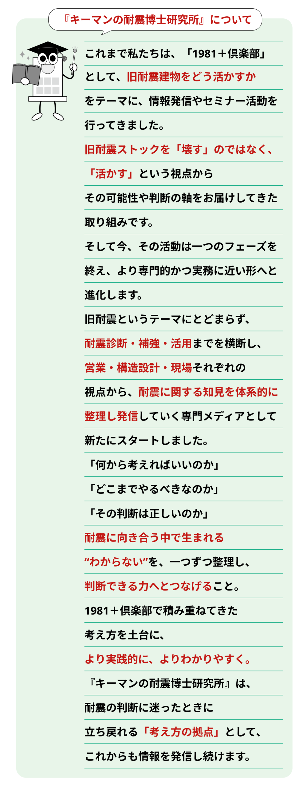 『キーマンの耐震博士研究所』では、耐震のプロが現場で培ってきた知見をもとに、複雑になりがちな耐震の情報をわかりやすく整理し、“判断できる力”へとつなげるセミナー・イベントを開催しています。